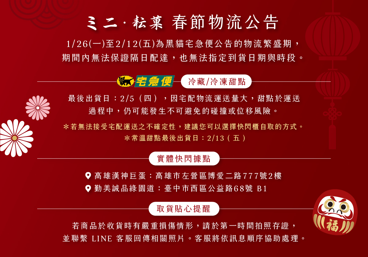 🧧【 常溫宅配 】𝟏/𝟏𝟗 (一)~𝟐/𝟏𝟎 (二)